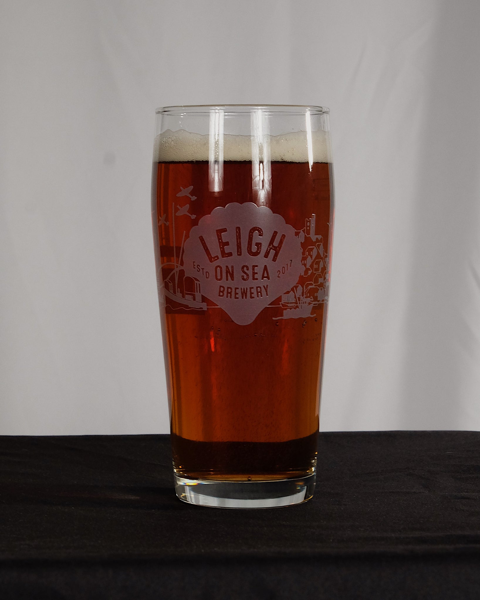 Leigh on Sea Brewery pint glass featuring all the favourite local landmarks that feature in our branding. In the classic German Willi Becher shape. Perfect for beer from our minipins, 440ml cans or 500ml bottles. Full to brim is 1 pint.